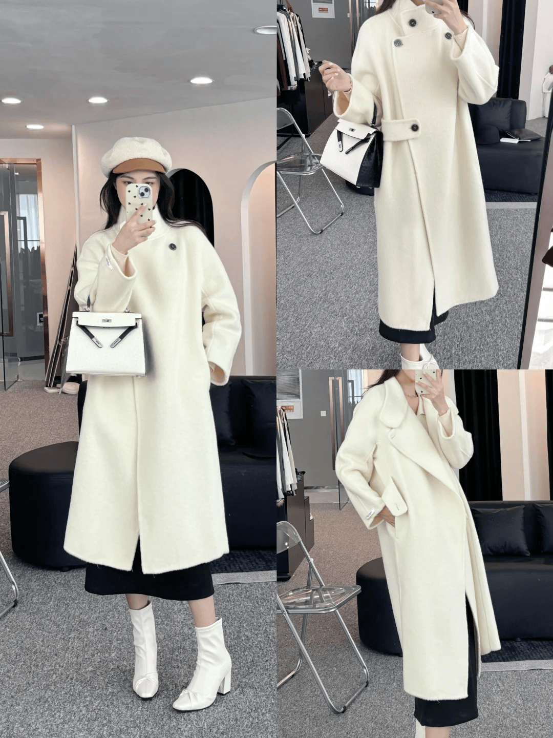 白色长款大衣+深色裙装:白色长款大衣以其高贵典雅的气质,成为了众多女性的心头好。搭配一条深色裙装,不仅能够通过颜色对比营造出更加鲜明的层次感,还能通过裙装的优雅设计,展现出女性的柔美与温婉。这种搭配方式既适合参加重要场合,也适合日常约会等浪漫场合。