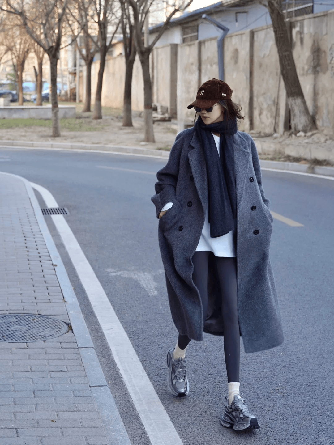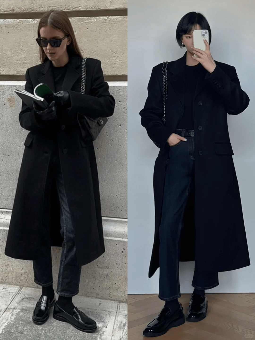 黑色长款大衣+深色牛仔裤:黑色长款大衣以其经典百搭的特性,成为了众多女性的首选。搭配一条深色牛仔裤,不仅能够保持整体的简约感,还能通过牛仔裤的休闲气息,减轻黑色大衣的沉郁感。这种搭配方式既适合日常出行,也适合逛街购物等休闲场合。