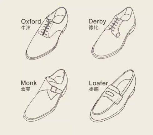 正式场合:牛津鞋、德比鞋、孟克鞋半正式场合:德比鞋、孟克鞋、也可布洛克款式的鞋履休闲场合:乐福鞋等