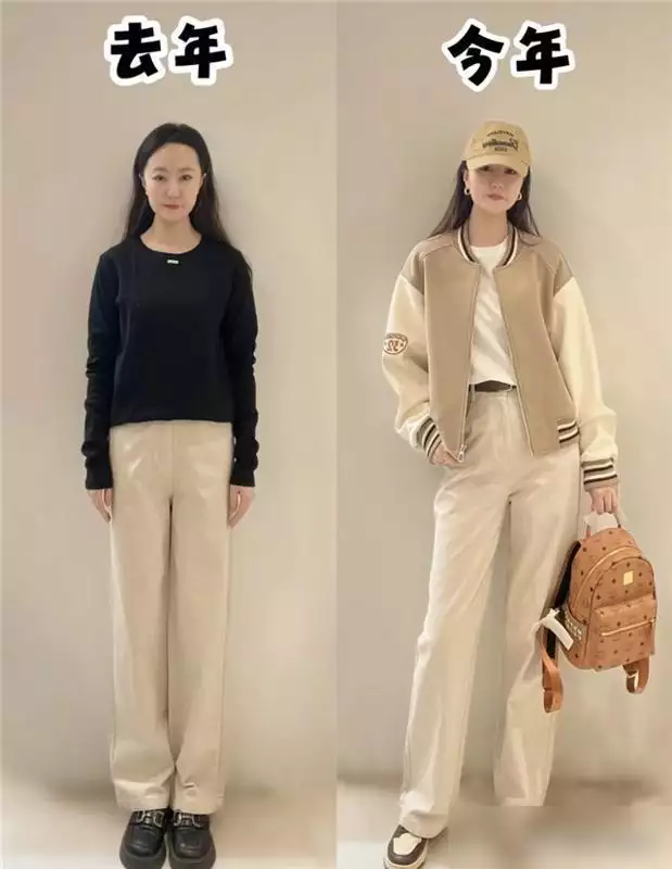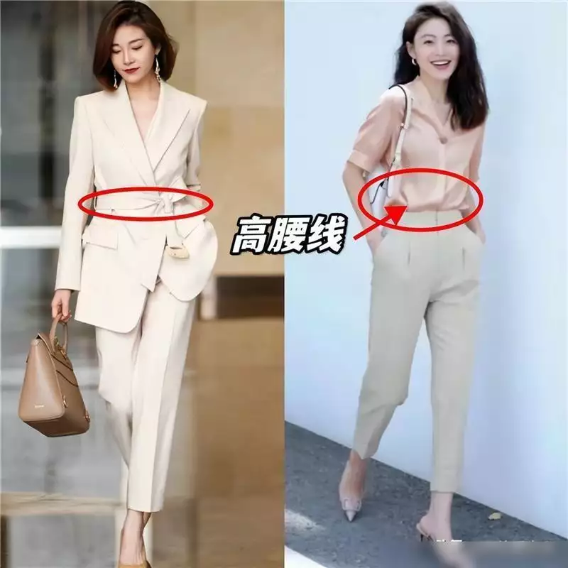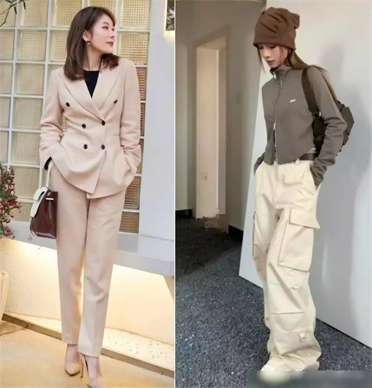 杏色裤子和西装外套的搭配,既展现出女性的优雅气质,又能显瘦显高,给人一种干练利落的感觉,西装外套的挺括剪裁与杏色裤子的柔美色调相结合,形成了完美的视觉平衡。无论是搭配高跟鞋还是运动鞋,都能展现出时尚的气息。尤其是腰部选高腰剪裁,瞬间拉伸腿长。