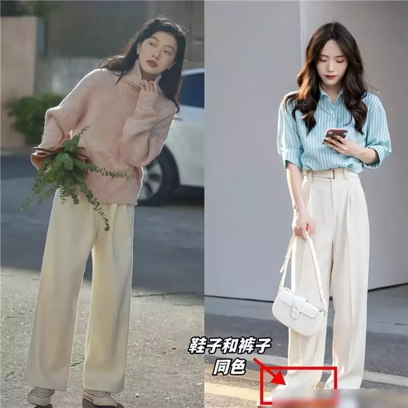 杏色裤子和鞋子同色的搭配方式是一种常见的视觉延长腿部比例的技巧,通过选择与裤子颜色相近或相同的鞋子,可以在视觉上延长腿部线条,从而达到显高的目的。