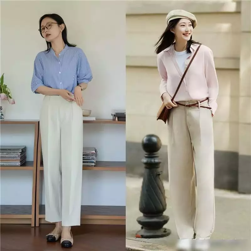 衬衫的颜色和款式选择,确保与杏色裤子的风格相符合,以保持整体的协调性。例如,选择柔和的色调和简约的设计,以突出裤子的优雅和知性。