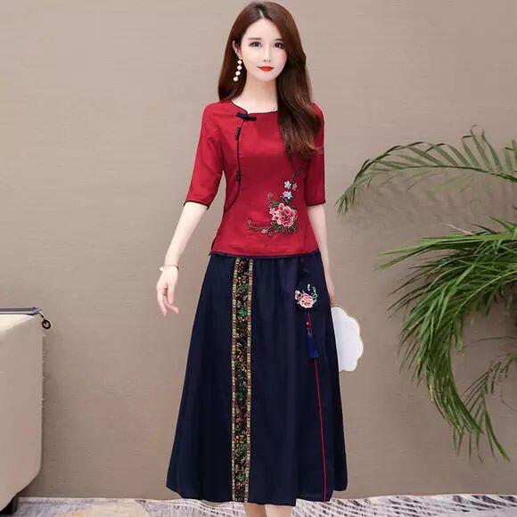 WH-JLNH-A281 新款七分袖绣花时尚小衫+百搭气质半身裙