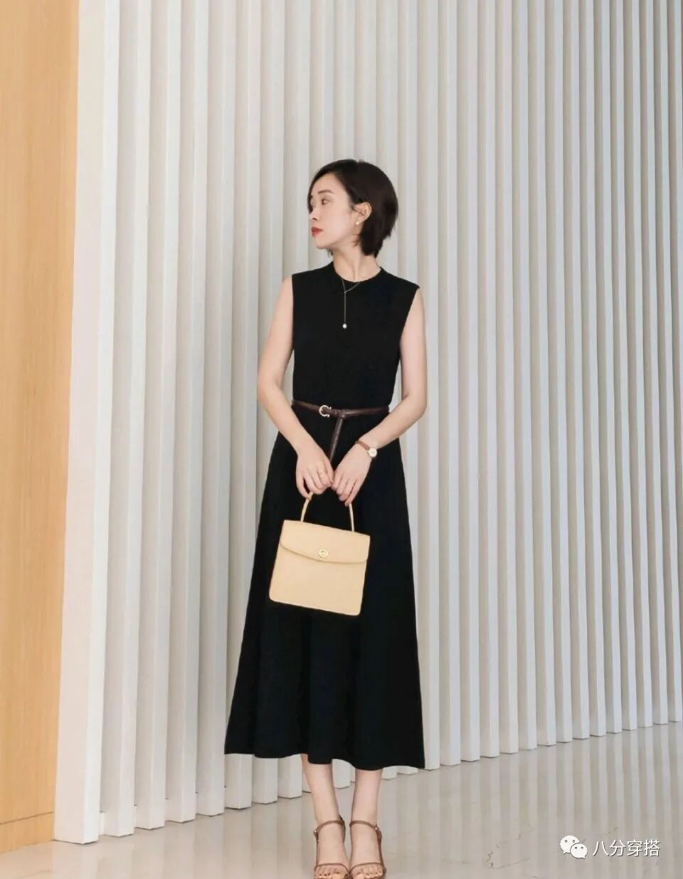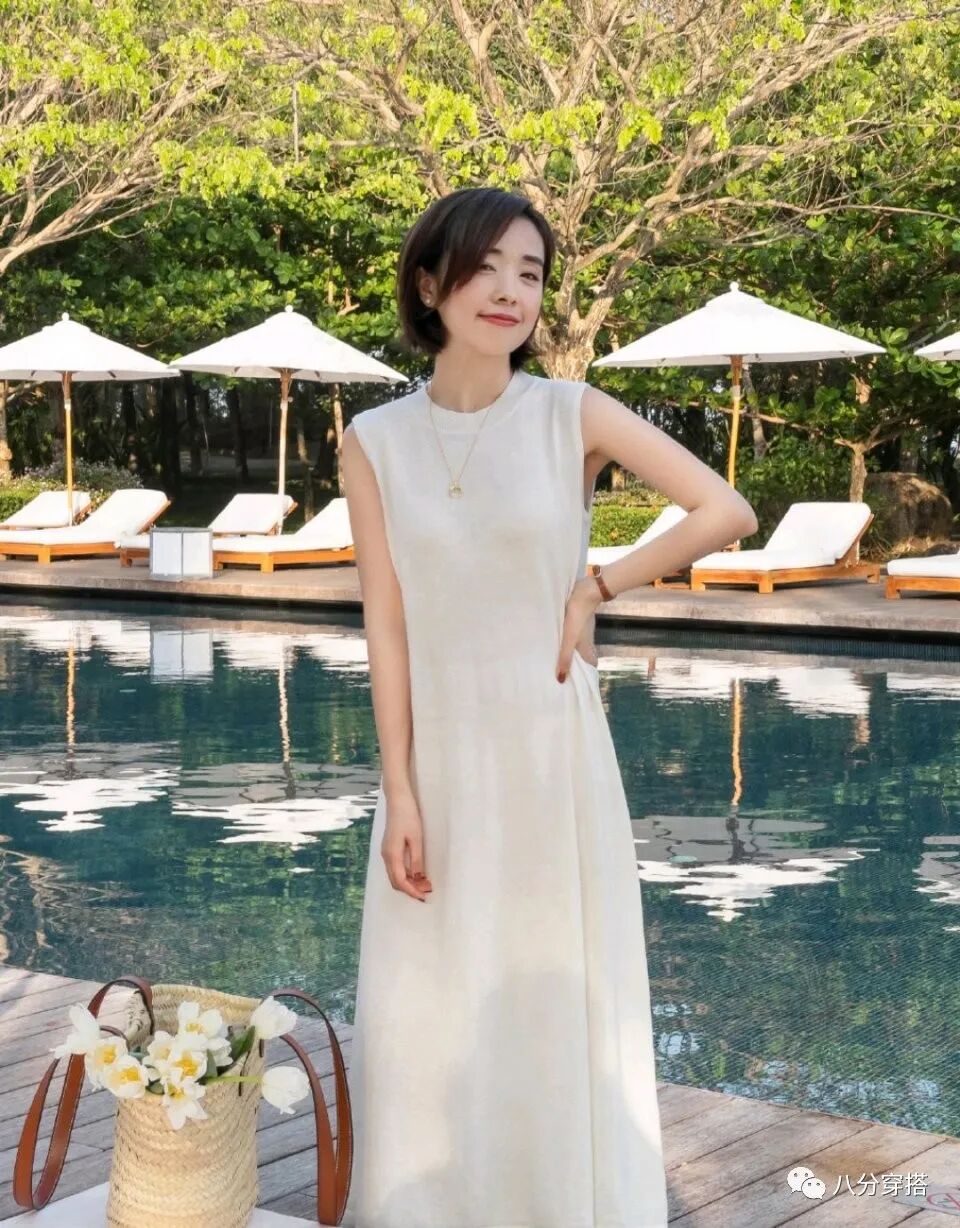 白色更加清爽,但是在视觉上也存在显胖的问题,它的相反色黑色也值得一试,更加稳重内敛,而且显瘦效果也是一流的,如果觉得纯色连衣裙单穿有点单调的话,简单的配饰点缀会有意想不到的效果呢,一条简单的项链,一颗白色珍珠垂落下来,优雅高贵,搭配上深棕色的细腰带,勾勒腰线的同时也能够增强整体造型的层次感,更加的时髦高级。