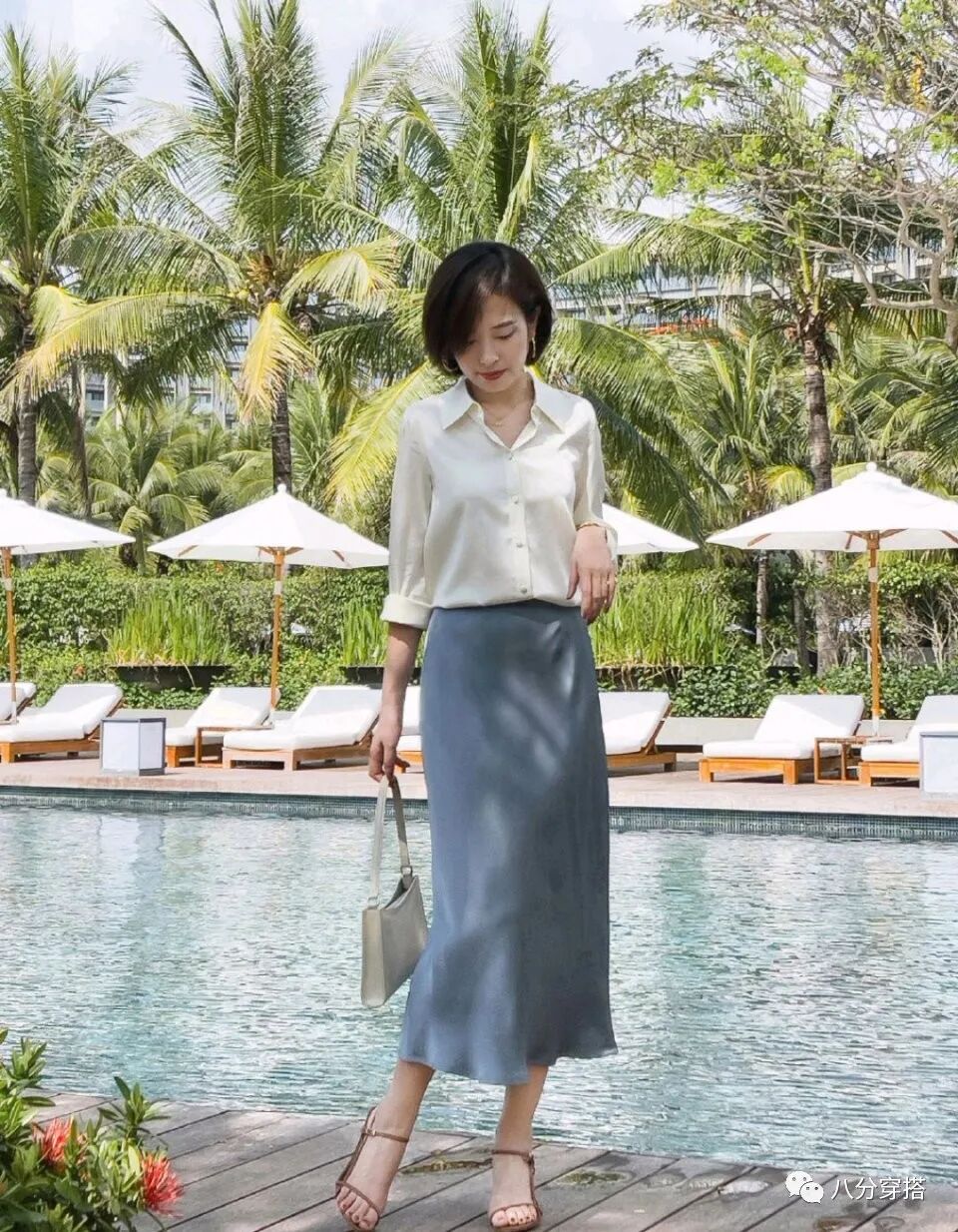 衬衫和半身裙的组合屡见不鲜,在材质方面花费一番功夫可以让整体造型的时尚度更上一层楼,垂坠飘逸的面料自带轻盈高级的感觉,穿在身上随着我们的走动好会发出些许光泽感,真可谓是摇曳生姿,高级洋气。