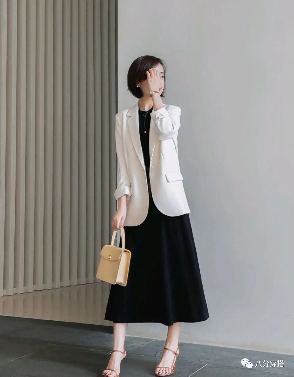 在上面连衣裙的基础上,搭配上一件知性干练的白色西装,色彩搭配极简干净,经典大方,连衣裙的优雅温柔碰撞上西装的干练利落,作为职场穿搭也很合适,简单清爽给人的感觉也很有女强人的风范呢。