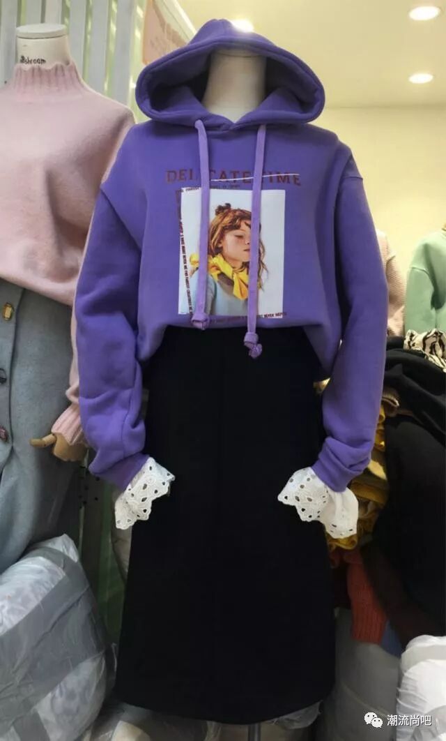 卫衣一直都是非常受欢迎的款式,而如今卫衣也有很多新的创意。一款经典的卫衣在袖子上添加蕾丝的点缀,让卫衣更加的活泼富有女人味。黑色半裙+紫色卫衣看似简单,其实却有一种不一样的时尚之美,黑色和白色蕾丝的反差色让整个搭配明亮的许多。