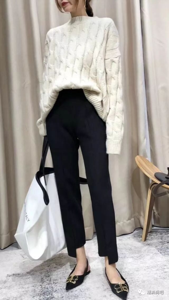 这两年露脚踝成为了一种穿衣技巧,不要小看了这个露脚踝,个子矮的女生这样穿搭可以拉长身高视觉。秋冬毛衣是必备品,白色毛衣+黑色裤子是很不错的显高穿搭。毛衣的选择可以是宽松型,根据自己的骨架大小而定,在裤子挑选最好是高腰的,除了小脚裤可以选择直筒裤,穿起来也有不一样的舒适感。将前面毛衣下摆束在裤子里面,就可以在视觉上显高啦。