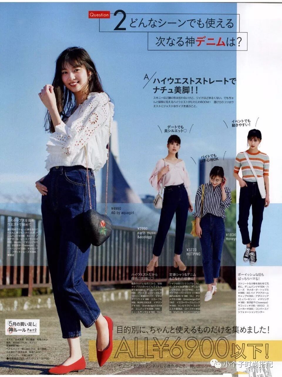 3、强调腰线。它能让你的整个身体比例调节到最完美,其实做到这一点很简单,比如短上衣+高腰裤,喜欢穿牛仔裤/裙的不妨把上衣塞进去,长腿效果立马显现出来,腰带起到的作用也是一样的。