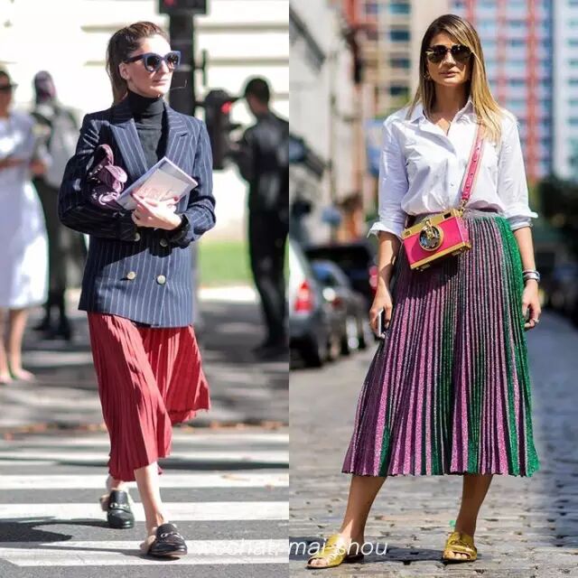 高腰款式的百褶裙有助将腰线提高,视觉上胸以下的都是长腿,有增高的效果,以平底穆勒鞋跟百褶裙配衬,更见文青气息。