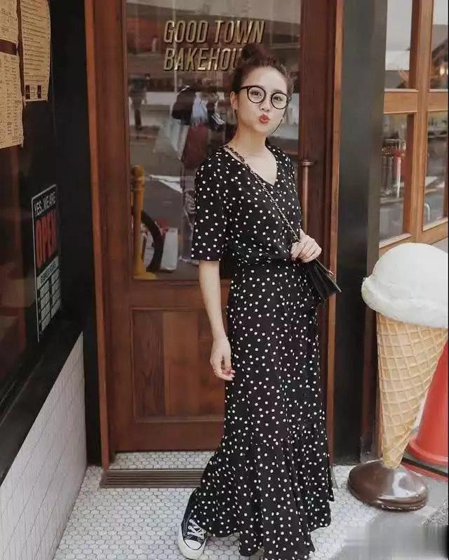 黑色底白色波点的连衣裙时尚又优雅,波点元素增添了甜美和少女感,连衣裙高腰处的收腰设计提高腰线特别显高。裙子的V领口设计修饰脖颈和脸型,尽显精致和优雅。脚上穿一双黑色的帆布鞋,休闲时尚,简约又高级。