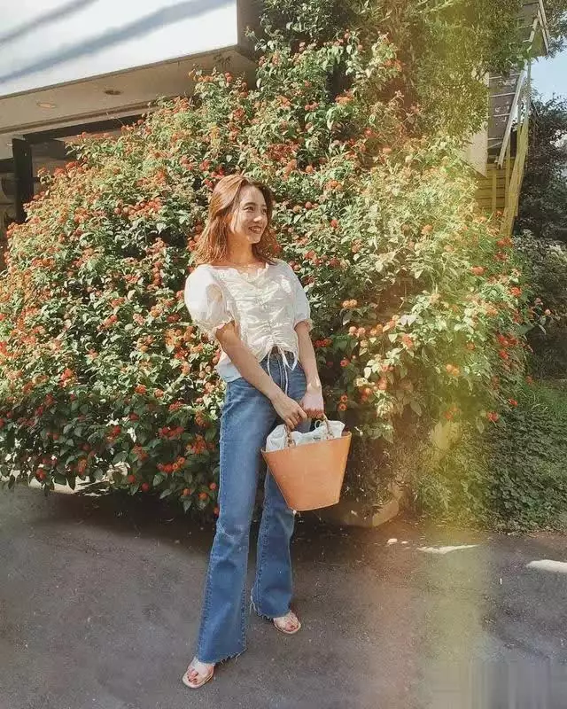 白色的短款衬衫甜美又气质,泡泡袖尽显可爱气息,褶皱设计充满温柔女人味,露出肚脐性感又清新。下身搭配高腰的牛仔裤刚好打造出高腰线,让小个子看起来显高又显瘦。裤管的微喇设计修饰腿型,复古又优雅。整套搭配简约又精致,时尚又有高级感。
