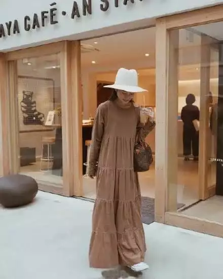 白色的帽子提亮了大地色系的素雅连衣裙,让简单低调的连衣裙瞬间提升了时尚感,简约又气质,充满高级感。