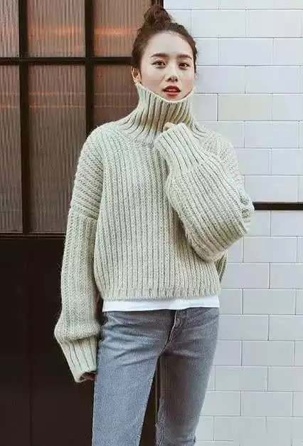 相较于特别吸睛的亮色系,这位小个子更喜欢穿柔和的颜色,反而会更显高级感。莫兰迪色系的高领毛衣简直太养眼了,舒服耐看又很显白,时尚又很高级,搭配简约的牛仔裤,简单大方,活力十足。
