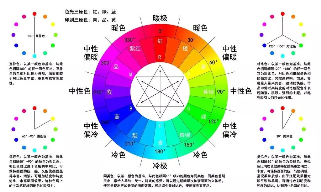 我们来继续研究色环,色环相对的颜色是对比色,对比色绝对不能出现在你的一身行头里。可以穿啥呢?邻近色。色环左下脚已经标明邻近色啦,男士们注意看,研究研究,颜色是个新大陆,打开之后会助你穿衣一臂之力!