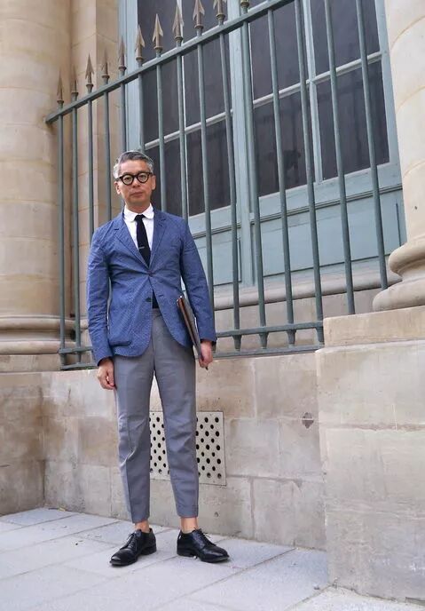 日系男的时装穿搭重点非常简单亦深受欧美的时装影响,例如《POPEYE》杂志前总编辑木下孝浩就爱以简单的日系蓝色西装褛衬灰色高腰西裤,带点美国风的Thom Browne元素又有点日系时装的感觉。