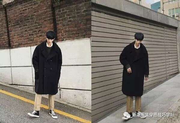 内搭可随意进行搭配了,不过最好选择衬衫与针织衫是最好的选择。黑色的长款宽松外套虽然是韩国流行起来的服装,但通过搭配后可不只是给人韩式风的感觉哦~搭配上一条淡棕色的休闲卷边长裤后,居然给人些许日系风的赶脚,也许是因为整体以及帆布鞋的搭配吧。不过这么穿确实很有日系风的休闲时尚感,并且在冬天也非常保暖。