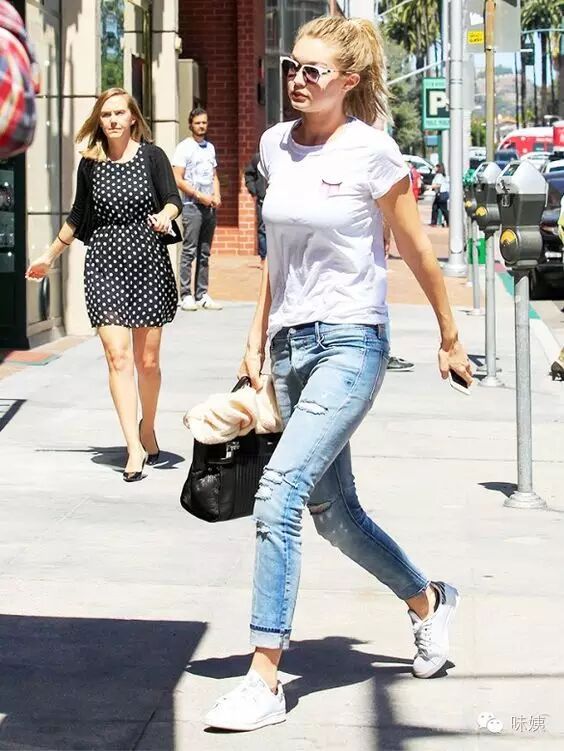 简简单单一件白T跟破洞牛仔裤就能穿出时髦个性,再用亮色包包作为点缀,整体造型简单时尚又有活力。