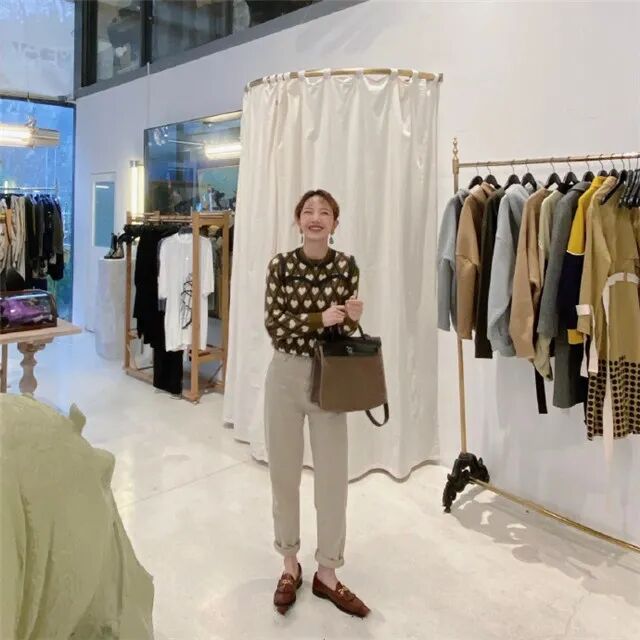 下图中也是“上短下长”的搭配,这样的搭配能够很好的优化身材比例,达到显高显瘦的目的。超短的毛衣有着活泼的花纹,显得人非常精致可爱, 直筒裤能够修饰不完美的腿型,让腿变得更直,从而在视觉上,显得腿更长。
