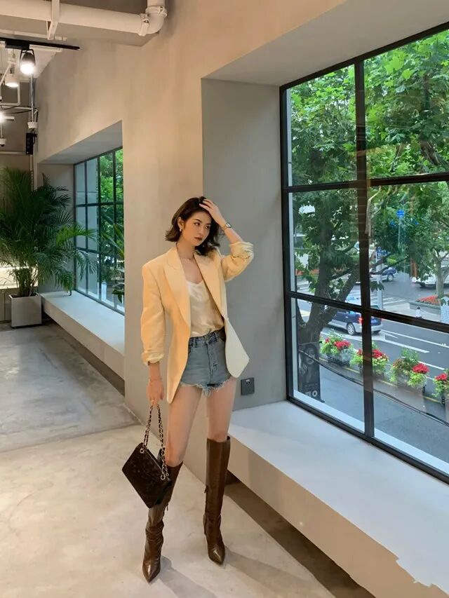 look1:西装+高腰短裤+棕色长筒靴