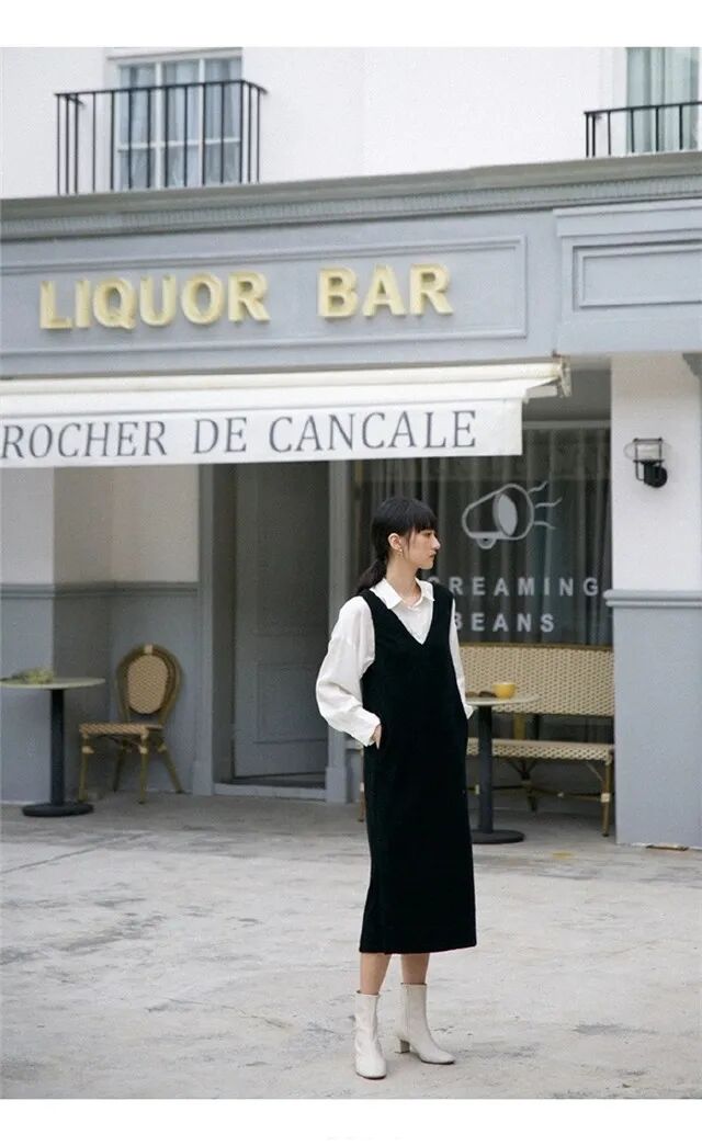 look3:白色衬衫+黑色背心长裙+高跟靴