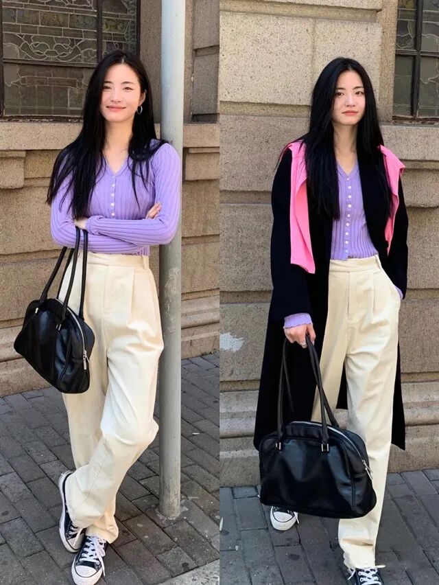 但是这样的搭配对于小个子来说就是不适合的,会显得下半身特别臃肿,像一个拖把。如果真要选择阔腿裤,可以试试版型不那么夸张的,九分的阔腿裤。