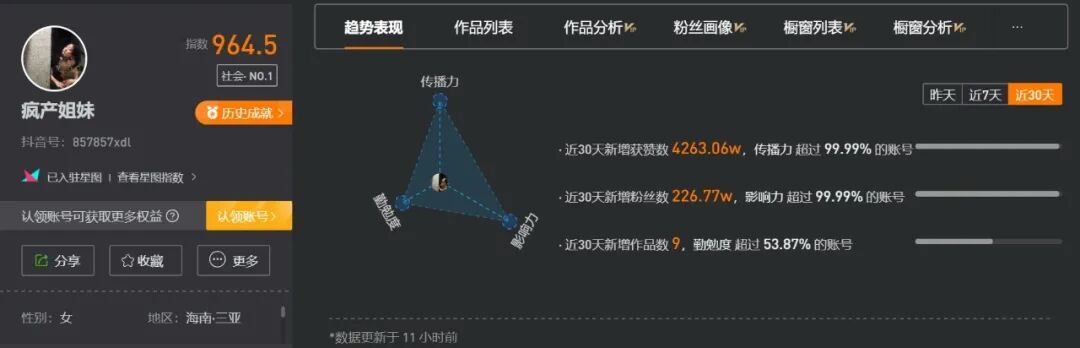 因为展现出的内容真实有趣沙雕,迅速吸引了一大波粉丝的关注和喜爱。根据数据显示,近30天新增粉丝数226w+,新增获赞数4263w+,传播影响力非常强。