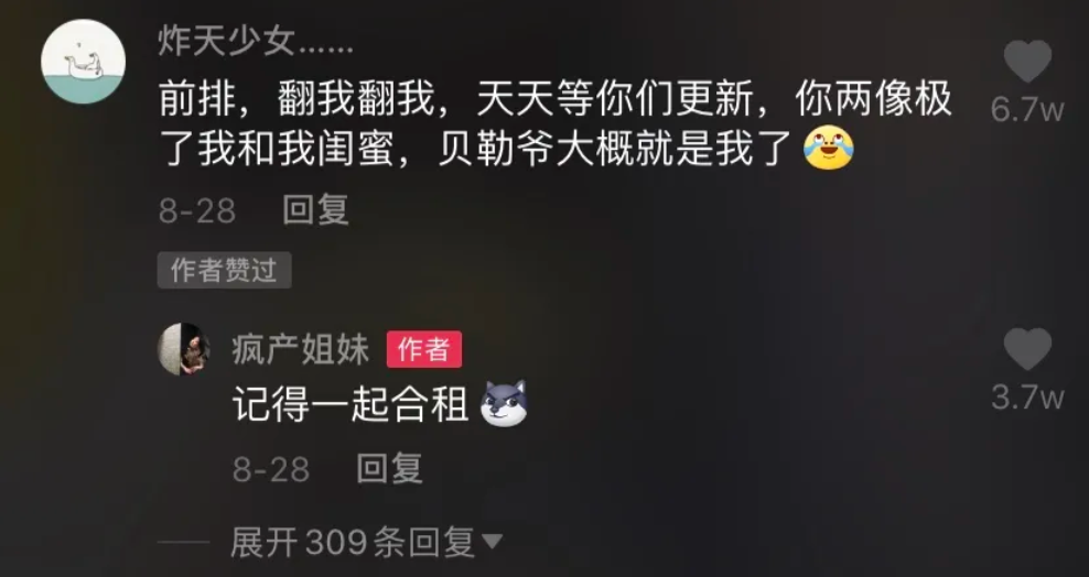比如邵雨轩“贝勒爷”这一外号就是从评论区粉丝留言得来的。@疯产姐妹在注意到“贝勒爷”这个外号后,由此发挥又创造了许多新的视频内容,收获爆款。