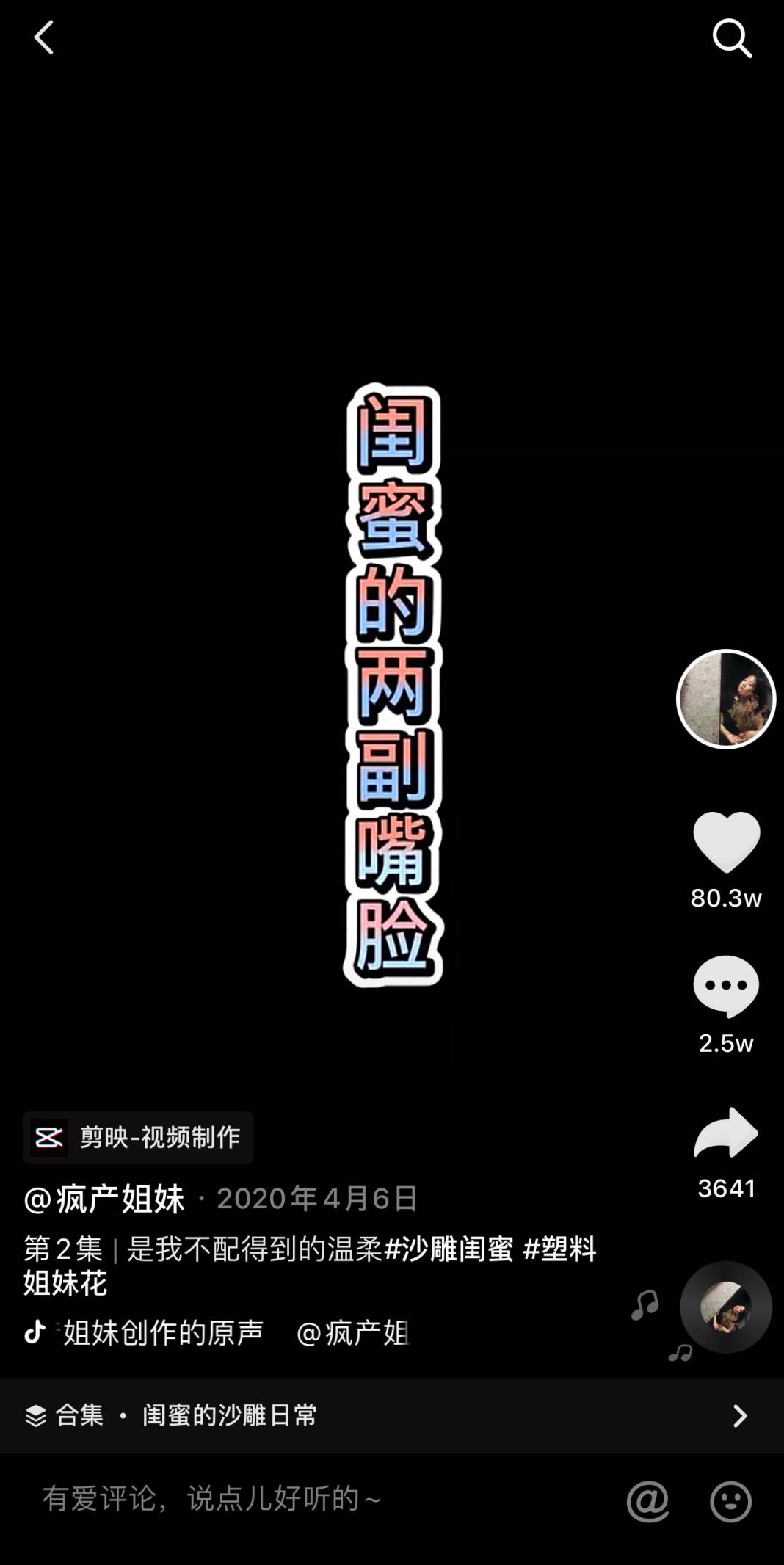 1账号定位鲜明@疯产姐妹早期视频围绕美食展开,真人不露脸,虽然食物拍得很好但反响一般,只有几千点赞数,账号并没有真正火爆起来。而让姐妹俩真正爆起来的一条视频竟然与美食无关,这条在2020年4月6日发布的视频“是我不配得到的温柔”,它的获赞量竟然超过了之前所发布的美食相关视频获赞量总和的两倍。