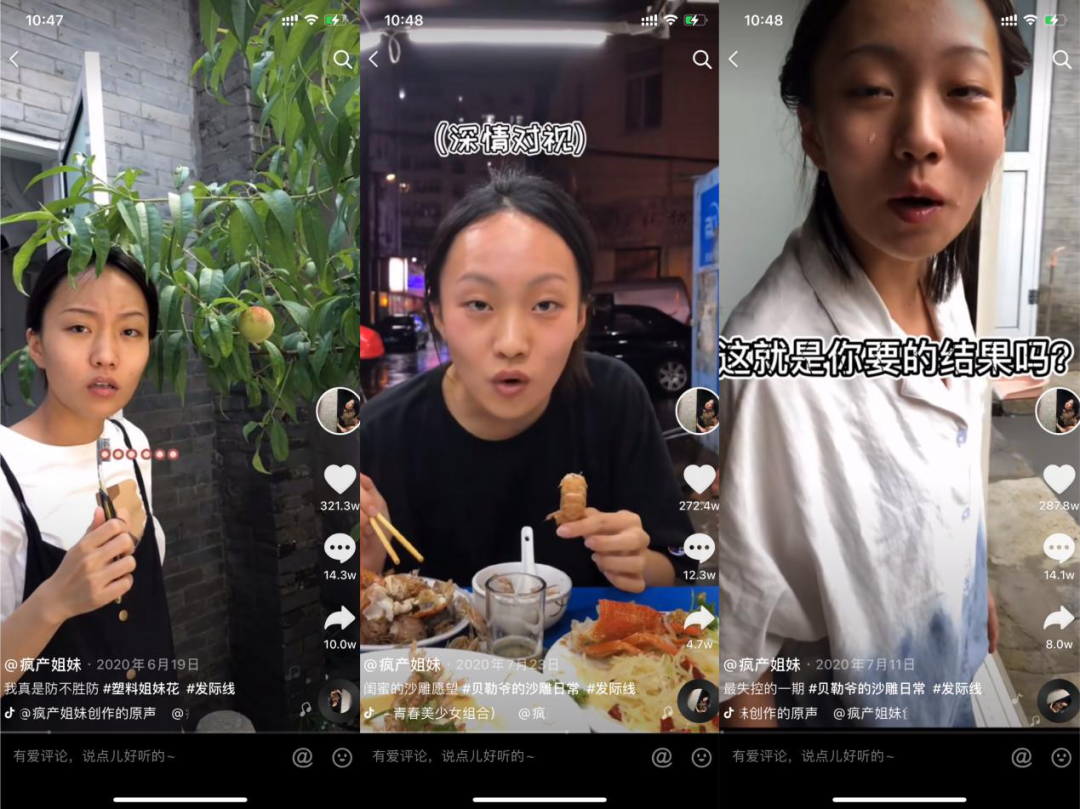 此时此刻,@疯产姐妹意识到需要改变自己的视频内容与风格了,于是迅速从美食博主转型成搞笑类生活记录博主,从拍摄美食转变为拍摄“人”为主,这让@疯产姐妹的创作更加松弛,也更加真实而接地气。