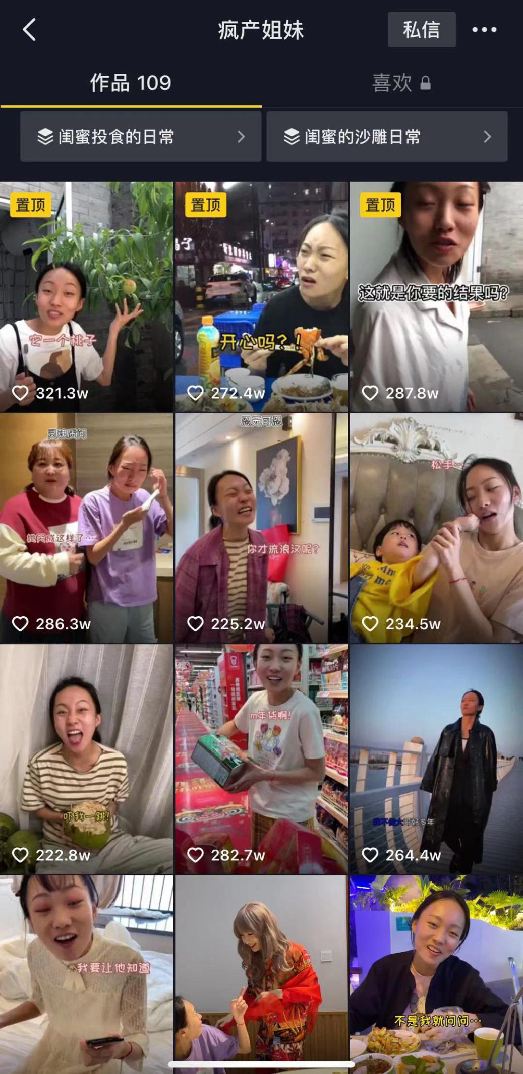从近期发布的一系列反映闺蜜日常生活的视频中基本上都收获了百万以上的点赞,可以看出爆款视频的成批出现也能说明@疯产姐妹从美食账号转型成记录闺蜜日常的生活类账号是成功的。