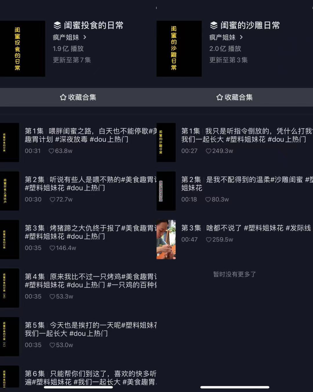 3从美食到记录生活从@疯产姐妹早期的视频内容中可以看出她们是想通过美食出圈,做一个纯粹的美食账号,机缘巧合因为一条记录了闺蜜“两副面孔”的内容成就了第一个小爆款,之后便转型成记录生活类的账号,这一过程则为广大短视频创作者提供了一个账号转型的思路。