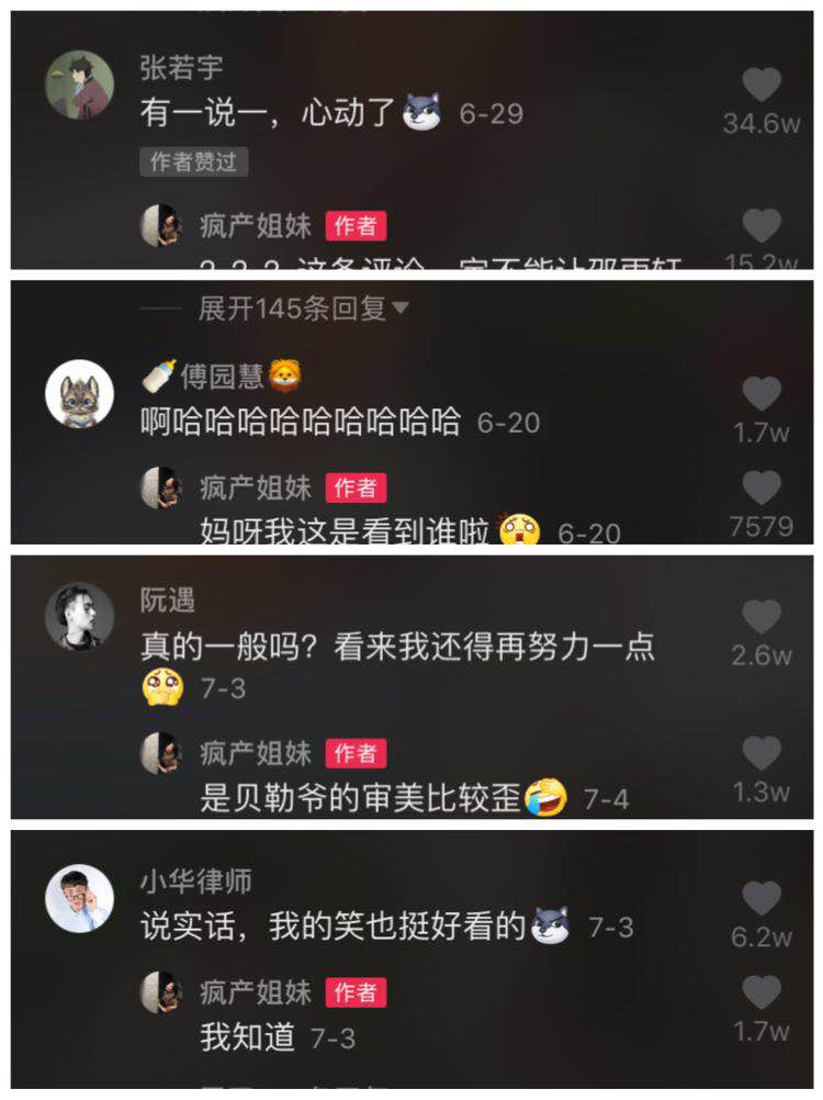 打开@疯产姐妹的评论区就更精彩了,满屏的“笑死了”、“哈哈哈哈哈哈哈”、“太搞笑了”,还有粉丝表示:“你们的作品我从头看到尾,每天看一看,得病不吃药。”