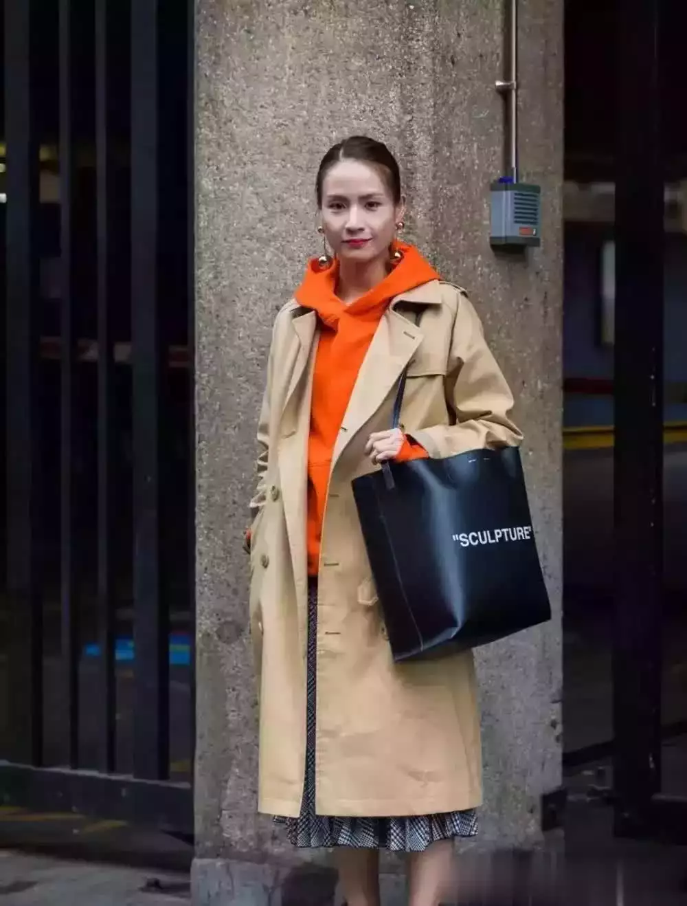 卡其色的风衣外套,内搭橘黄色的连帽卫衣,同色系的搭配既有层次感又有延伸感。内搭的靓丽也为经典平和的卡其色外套注入了青春活力。