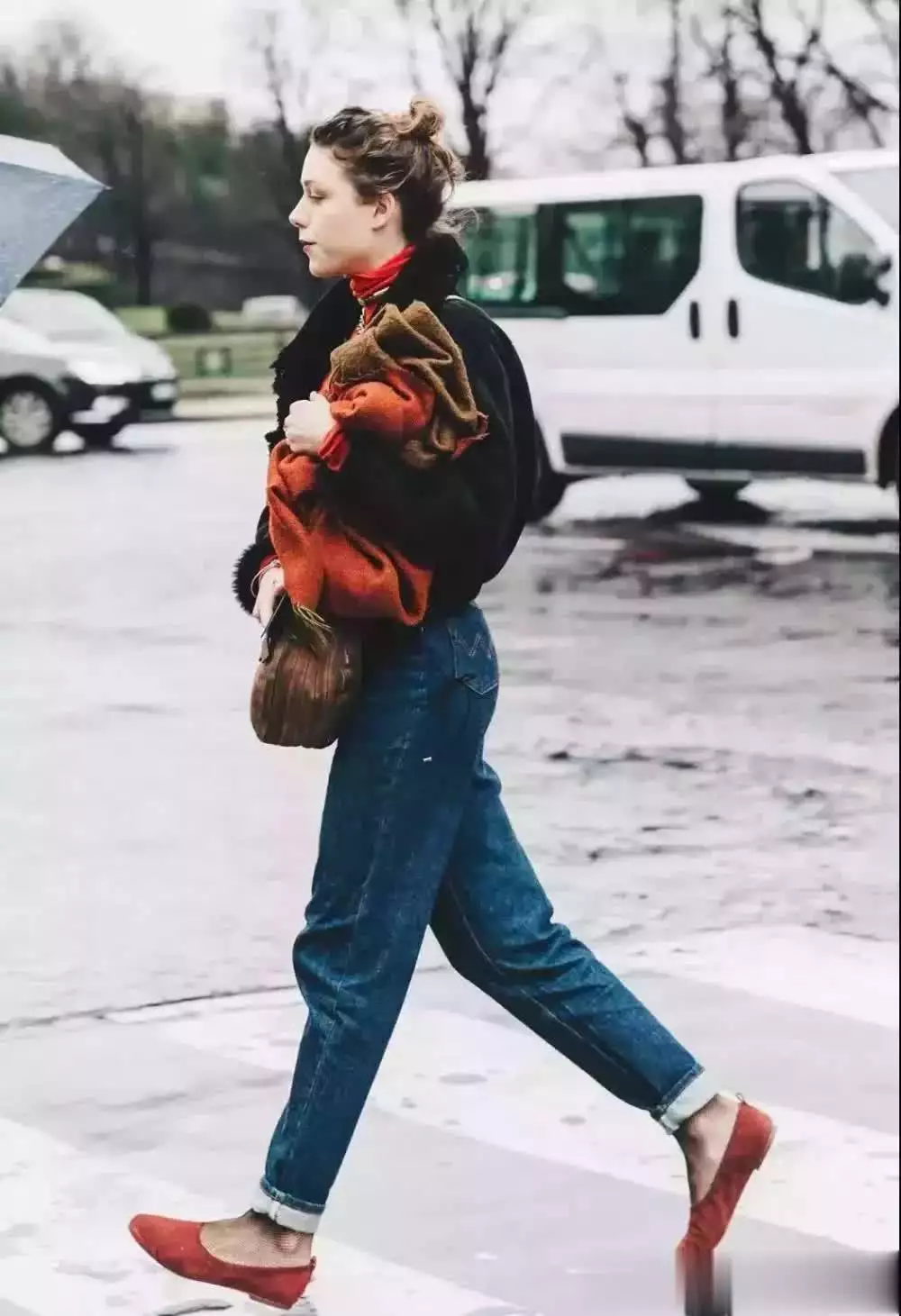 黑色的短款外套,搭配高腰牛仔裤,很显腿长显高。简约的搭配很经典,但容易显得平淡。内搭一件红色的高领毛衣,就提亮了整套穿搭。而且红色与黑色的搭配耐看又经典,脚上再穿一双红色的鞋子,跟高领毛衣颜色相呼应,协调一致又增添了几分活力。