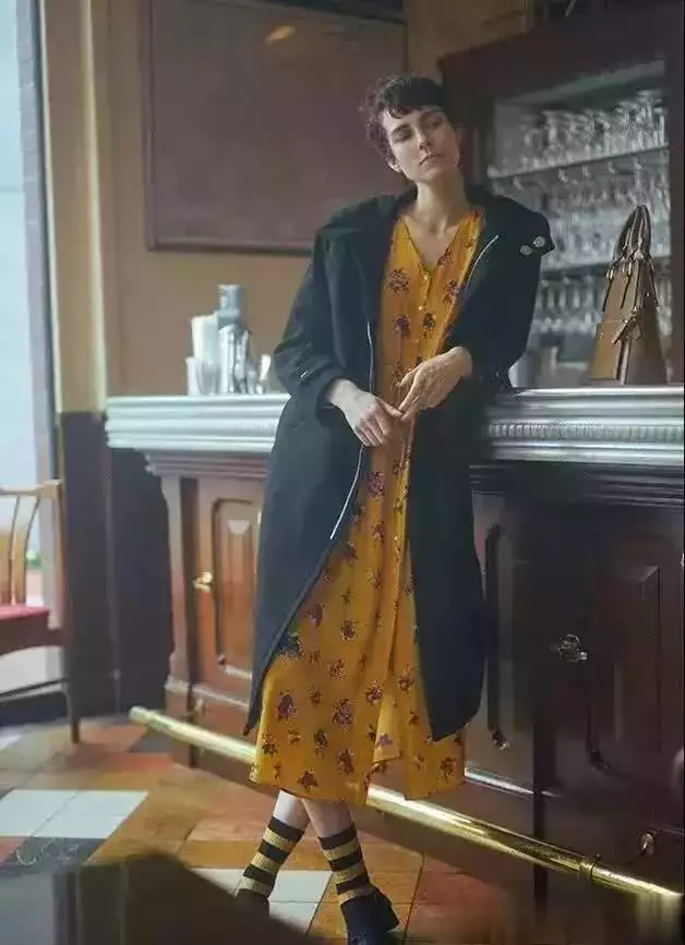 黑黄条纹的袜子非常趣味新潮,跟黄色印花裙以及黑色外套相呼应,让整套穿搭更加时髦、更有灵气。