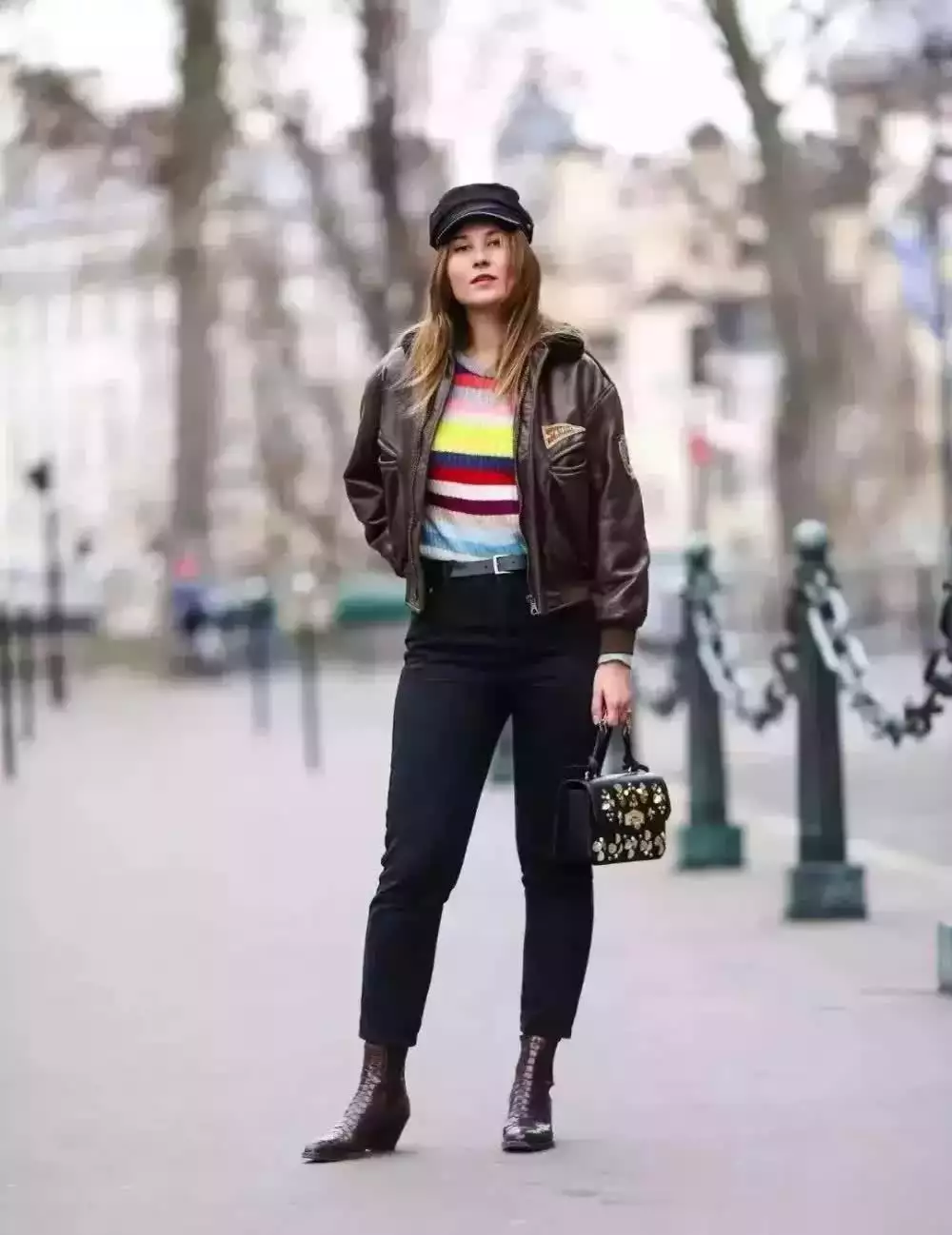 深咖啡色的短款外套,下身搭配黑色的高腰裤,上下装低调暗色系搭配,内搭用一件彩色条纹的毛衣就显得与众不同,时尚十足。