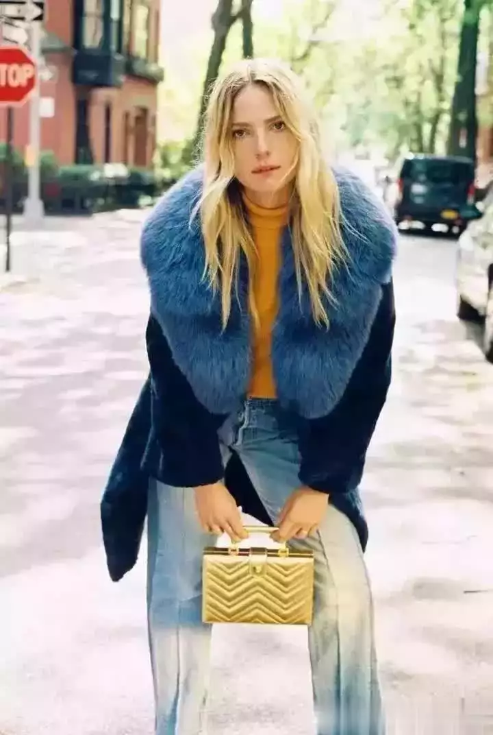 蓝色毛领外套跟蓝色牛仔裤同色延伸,协调又显高。内搭姜黄色高领毛衣,姜黄色的暖色调中和了蓝色的冷色调,为冬季的搭配增添了温暖,提亮了整套搭配。