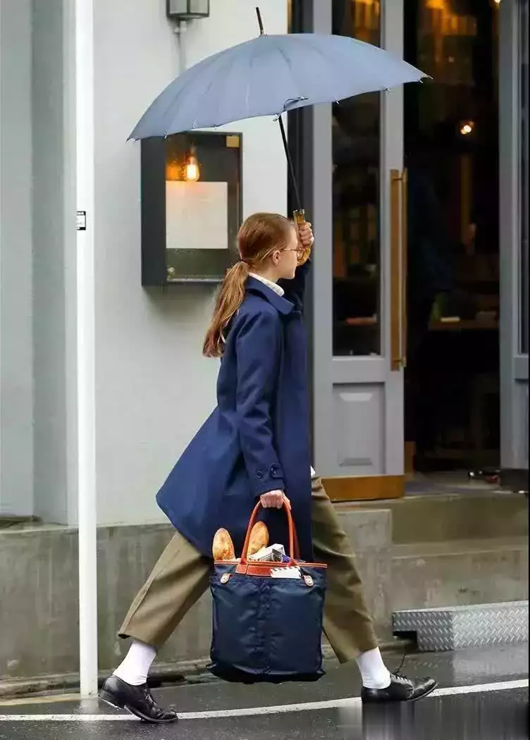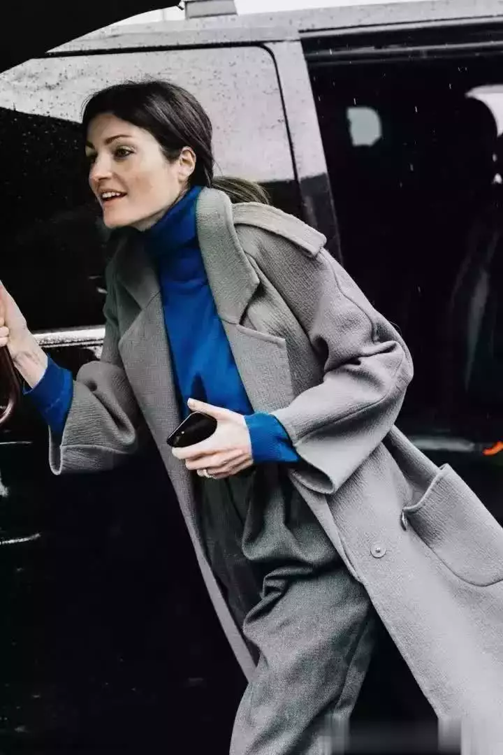 浅灰色的大衣搭配深灰色的高腰裤,高级又富有层次感。内搭的上衣选择蓝色的高领毛衣,靓丽又有质感。整套穿搭简约高级中又有理性沉稳的高品味,成熟经典中又有靓丽的时髦感。