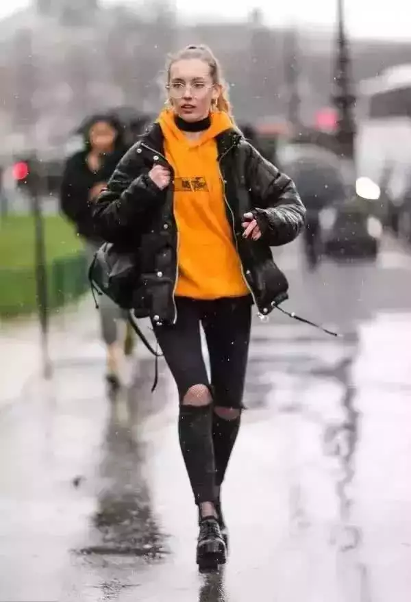 卫衣是今年很流行的单品,彩色的卫衣也更加新潮和靓丽,在冬季作为内搭来搭配暗色系的外套非常吸睛。黑色短款羽绒服,下身搭配黑色破洞铅笔裤,脚上也是穿着黑色的鞋子,整套黑的穿搭用一件姜黄色的连帽卫衣让整套穿搭脱颖而出。