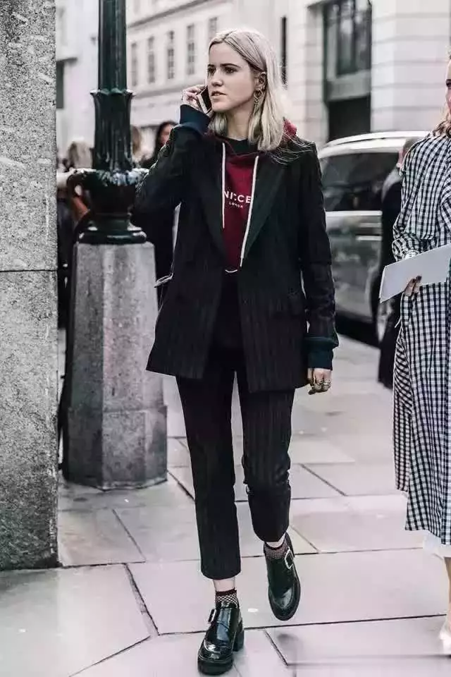 黑色条纹西装套装,干练经典又有点复古味道,小个子穿得不好难免会有点显老,而内搭用一件酒红色的连帽卫衣就避免了老气的风险。卫衣的休闲跟西装的干练混搭出时尚的趣味感,而卫衣的红色也打破了暗色的刻板,更显摩登味道。