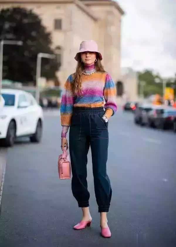 条纹元素经典又百搭,今年很流行的彩色条纹也受到很多时尚达人的青睐。随意的一件彩色条纹高领毛衣,搭配高腰休闲裤,显高又显瘦。毛衣的灯笼袖设计增添了几分甜美感,裤子裤脚的松紧带束口设计增添了几分休闲感。毛衣的彩色条纹时尚又靓丽。