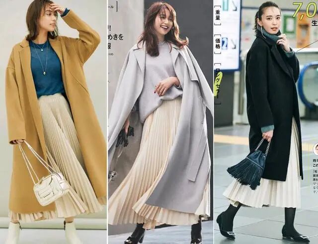 3、裙子要长一点,灵动飘逸更有女人味如果你在冬天也喜欢用裙子来表达优雅与女人味,那么就要特别注意裙子的长度啦!尤其是在用各种半裙、连衣裙来搭配廓形大衣的时候,一定要处理好裙子与大衣之间的层次关系,也就是大衣的长度不要超过裙摆。同时,还要注意把握好外套与裙子之间的轻重平衡,比如厚实的双面羊毛呢大衣,搭配材质轻薄的纱裙,或者线条灵动的复古百褶裙,让外套的厚重与裙子的轻盈飘逸达到平衡,整体会显得更和谐优美。▼