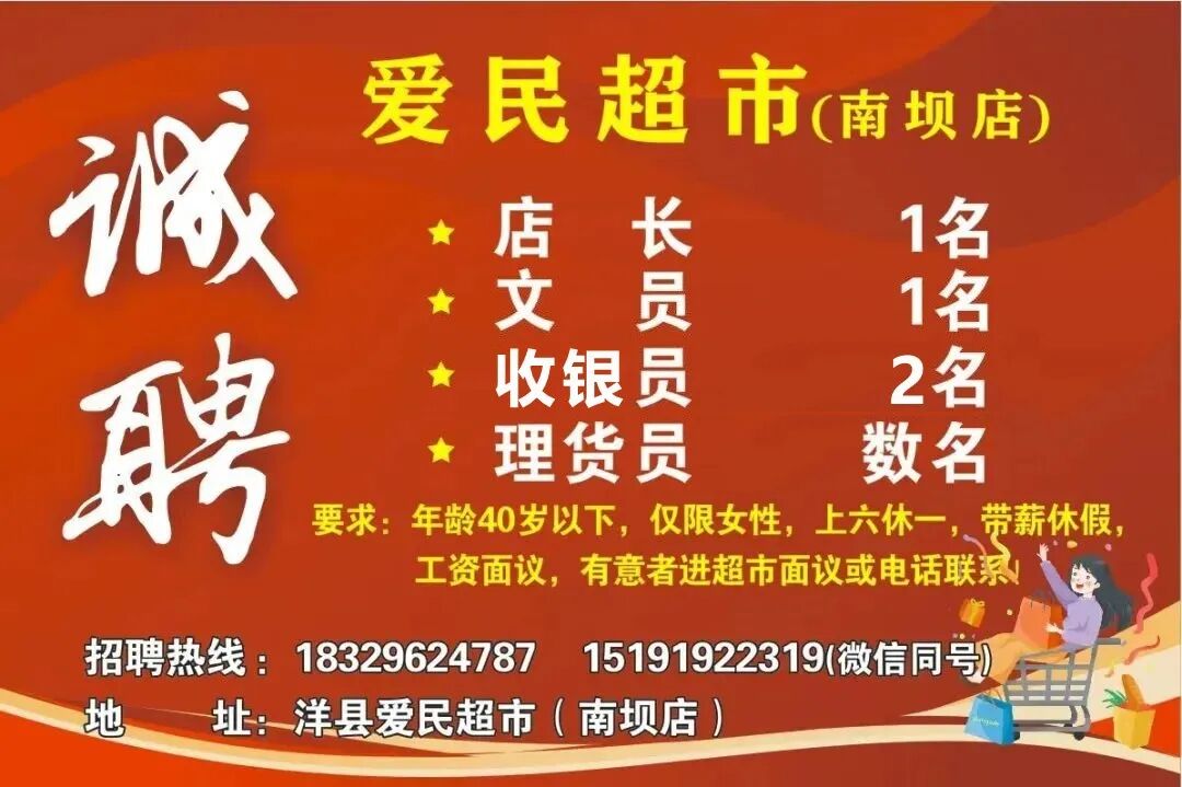 【招聘3*3】洋县诚瑞皓洁家政公司因业务发展需要,需招聘:1、办公室文员一名,要求沟通能力和文字功底强,踏实勤劳;2、单位、小区保洁数名,身体健康,吃苦耐劳,薪资待遇面议。联系电话 181 6176 4246 或 153 3251 0396【招聘2*2】美团外卖洋县站招聘配送员(骑手)数名,月薪4000至8000元,多劳多得,有吃苦耐劳精神,地址:和平路257号顺丰快递朝西100米,联系电话 157 1926 6232 微信同号【招聘2*2】洋县天合光伏,招聘业务20名,工作内容在农村开发愿意出租楼顶用户,工资每月6000至9000元。联系方式 136 1926 5996【招聘】洋县0713美容养生,招聘美容师5名,待遇面谈,每月带薪休假4天,包吃!联系人:李总,电话 177 2906 5559【招聘】托管机构招聘市场招生人员2名,要求有销售工作经验,年龄适当,责任心强,沟通表达能力强。联系人:张老师 134 8818 6982【招聘】洋县成都冒菜现招聘服务员一名,要求:年龄42岁以下,身体健康,勤快利落。可带小孩。待遇优厚。电话 132 0924 5900 或 133 0916 4078【招聘】(百购24小时)聘收银员3名,要求:可适应白夜班两班倒,长期工作者,24至38岁,限女性,初中文化以上,形象气质佳,有独立工作能力!月工资2400起步(12小时制白夜班两班倒)。电话 199 9268 3199【售自建房】下纸坊街附近有新修两间四层自建房欲出售,该房屋每层为独立套房设计,布局合理,交通方便,环境清净,四址清楚,建筑面积350余平米。有意购买者看房议价,联系电话 134 6868 5202 微信同号【售房】天下城低层5楼有精装修电梯房一套,三室两厅,带家具家电、柴火房、车位,证件齐全,现欲出售。联系电话 184 2906 0265【门面出租】洋县北环路西段兴隆小区北栋,座北朝南,门面房出租面积48平米,无转让费,水电、卫生间齐全。联系电话 135 7148 3865 或 182 9264 8358【优质店铺转让】因个人身体原因,现无暇顾及。本店转让,地理位置优越,客源稳定,有意者请私信了解更多信息。联系电话 199 1617 6629 或 151 2969 5990【招聘】招聘照顾一岁四个月宝宝的阿姨。要求工作责任心强,有爱心,年龄60岁以下,月休4天,联系电话 153 8456 2800【招聘】招聘兼职美甲师多名,主要制作穿戴甲,要求有美甲基础,时间自由,可作为副业兼职也可全职,地点洋县,有意者可加微信咨询zp8023521_【招聘】洋县石英砂厂招聘男工,能吃苦耐劳,不怕脏,不怕累,年龄35至55岁之间,包吃住,工资保底4000元,地址:洋县戚氏街道戚氏村405路口。联系电话 198 9477 9656 李【招聘】凯伦电竞酒店招聘:前台1名,要求:有酒店前台工作经验者优先,口齿伶俐语言表达能力强,长期工作,年龄20至35岁。工资待遇面议。地址:梨园大道中段金碧辉煌隔壁,联系电话 199 9262 3916 微信同上