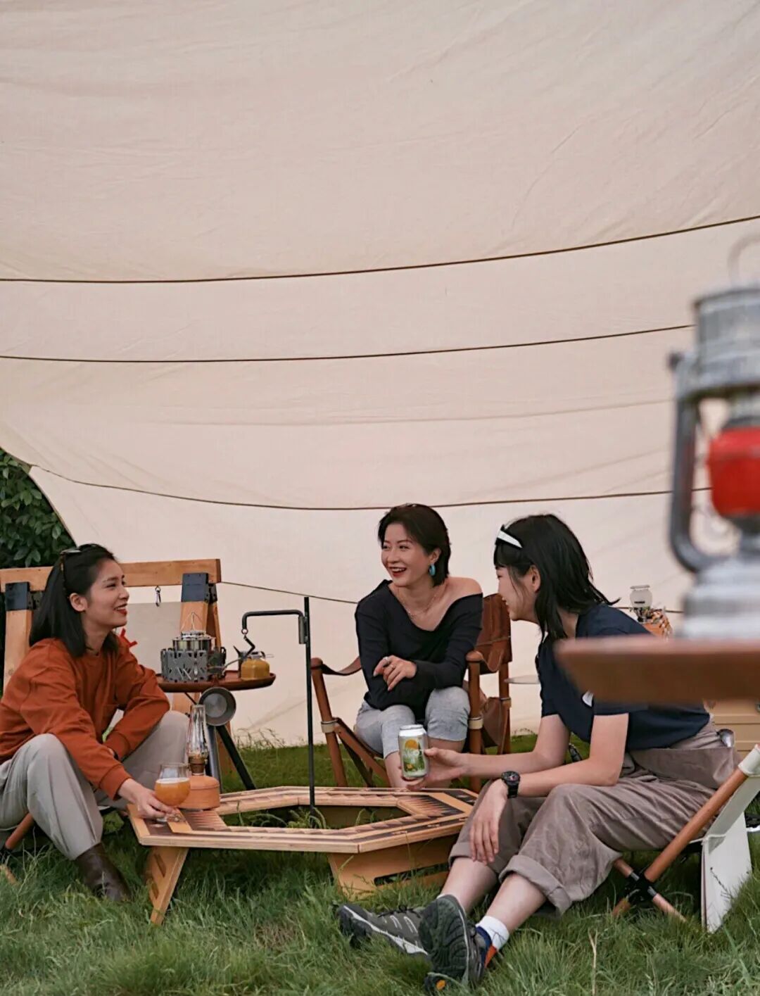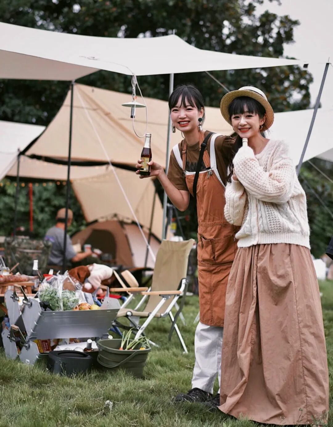 户外露营除了穿着舒适还可以走日系温柔风,将浅色的上衣搭配宽松的裤子,还可以和朋友一起穿同色系的搭配。