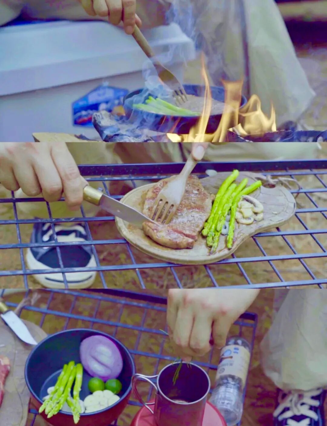 在露营时,直接用铸铁锅烟熏效果最好,等待食材表面变成赤褐色,就可以美味出锅啦。