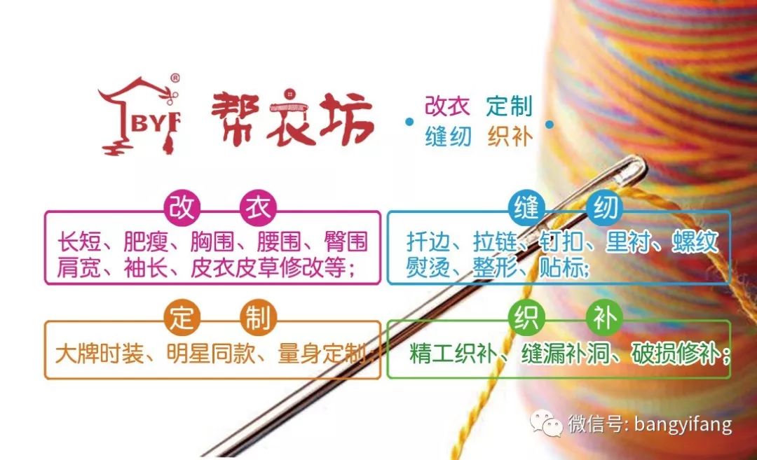 帮衣坊全国连锁服装改修品牌,以用爱心、贴心、细心、专心打造超越顾客期待的精品服务为宗旨,力争做中国服装改修行业的领军企业!!