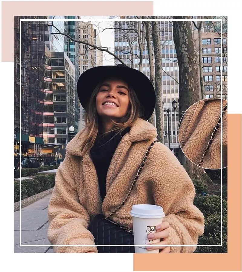而棕色是“泰迪熊外套”的首选,搭配简单不挑肤色,而且超级显气质,哪怕内搭夸张了点也能轻松hold住。