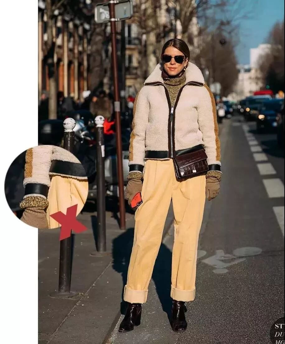 出袖边本身可以增加细节感,但是加上厚厚的手套看上去就会有些邋遢。