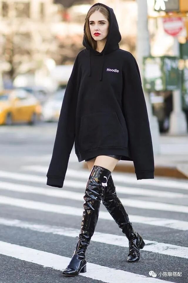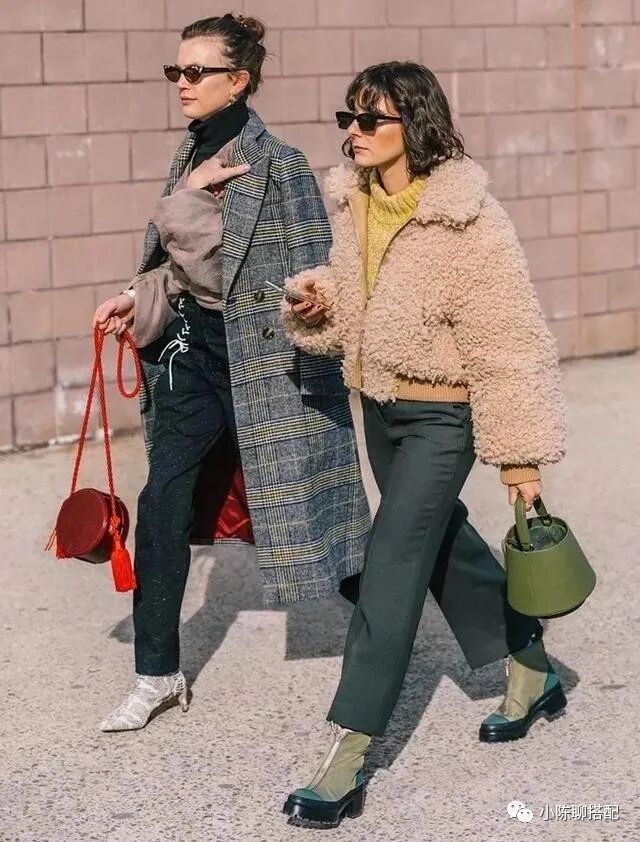 除了毛衣,外套也是同样的道理。拿最近几年比较流行的羊羔毛来说,虽然看起来很温暖,很多街拍人士都在穿。但是羊羔毛的纤维很长,视觉膨胀感非常强,加上材质比较软,穿在身上肩部、袖子、领口等都会呈圆线条,微胖女生穿起来很容易显得肩宽背厚。